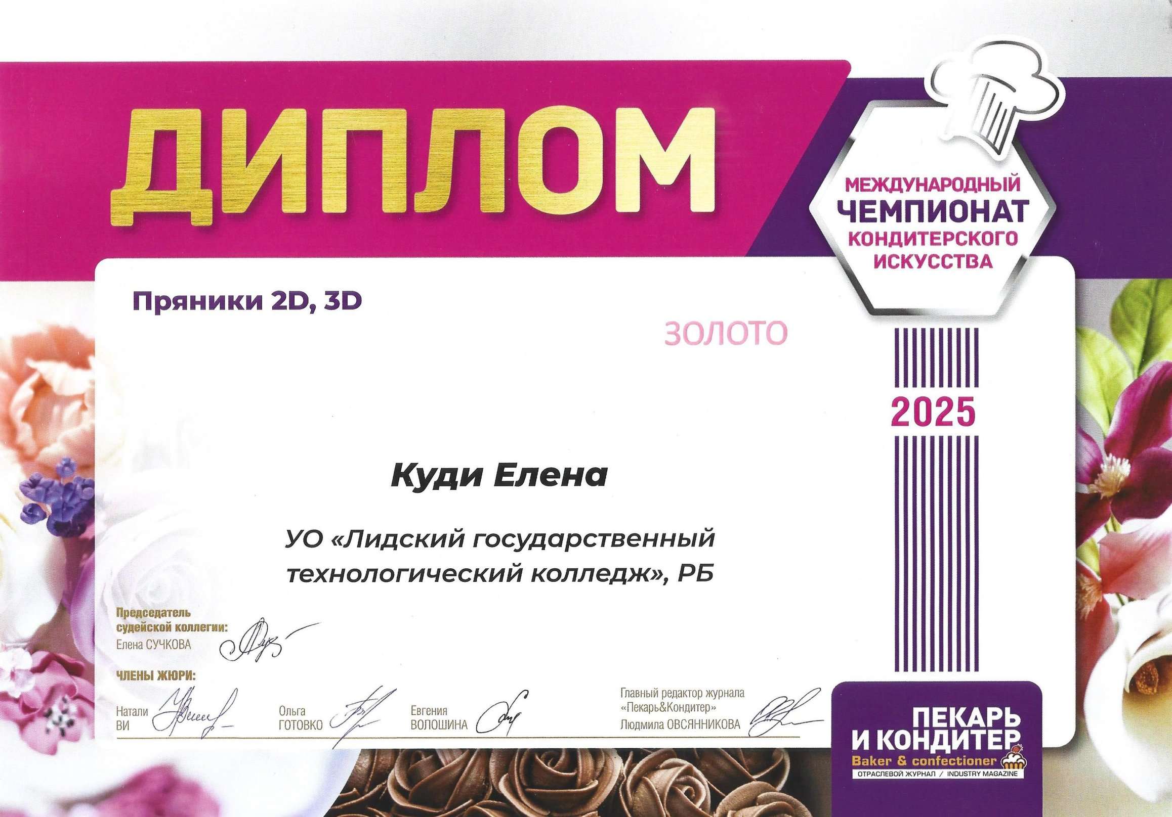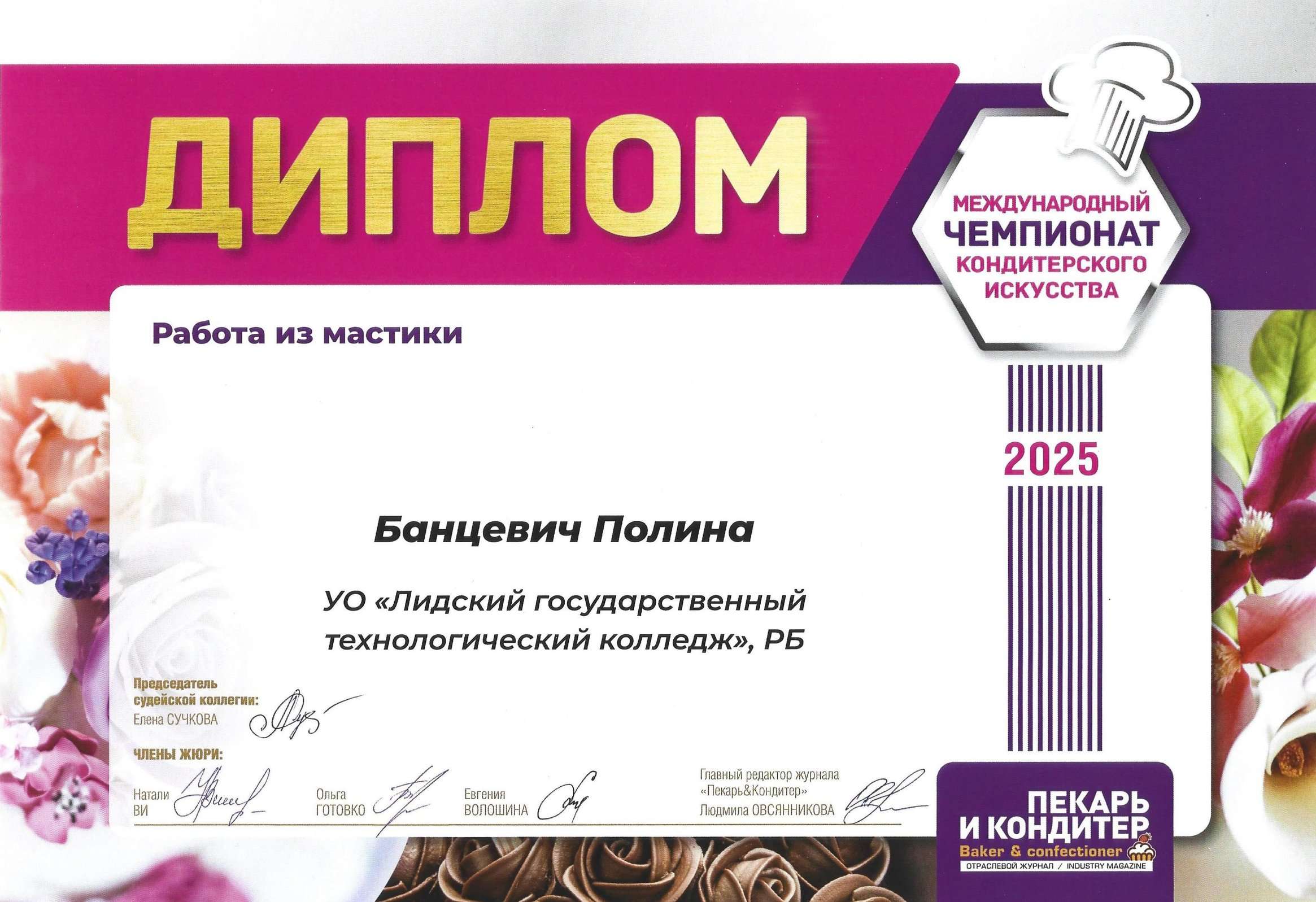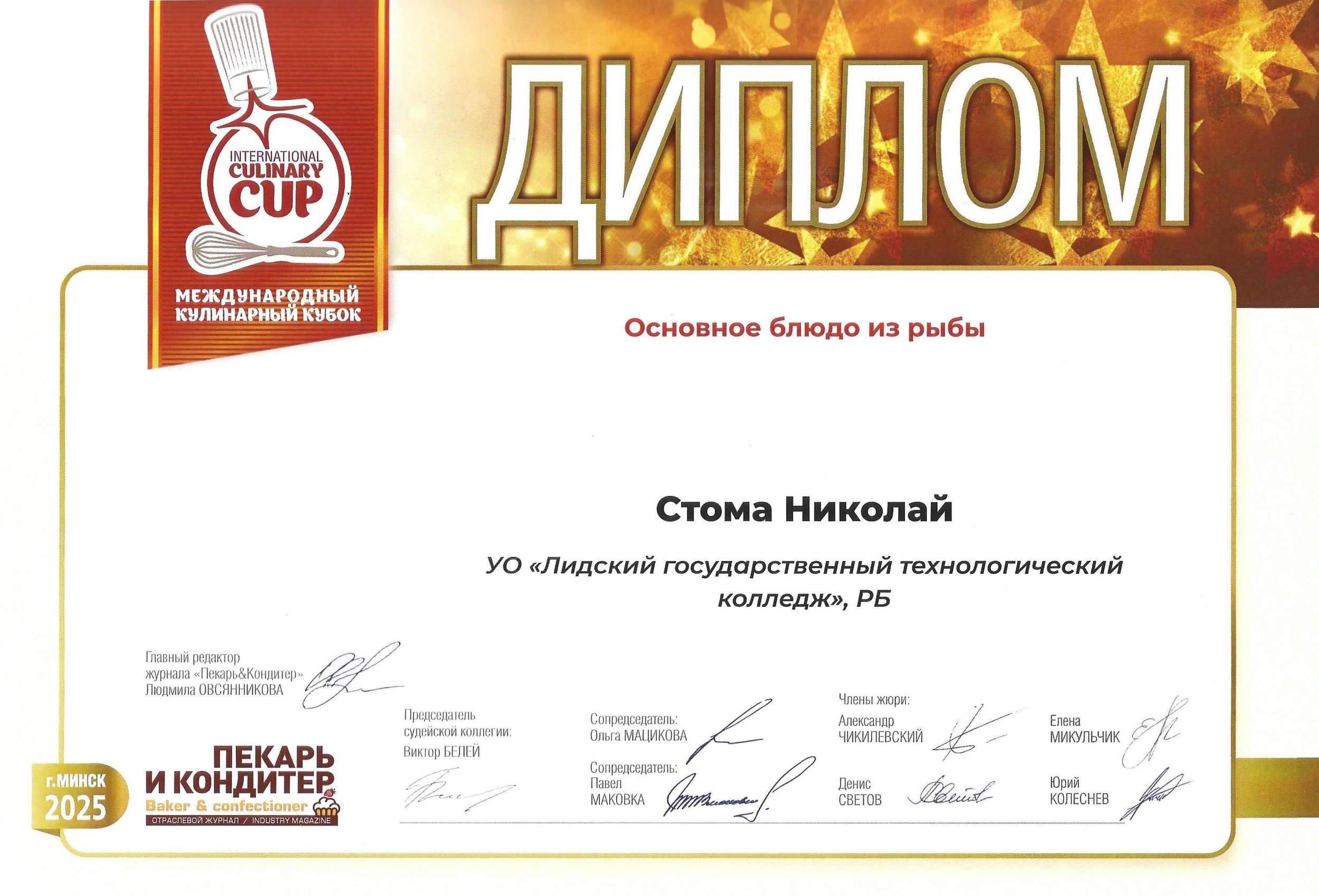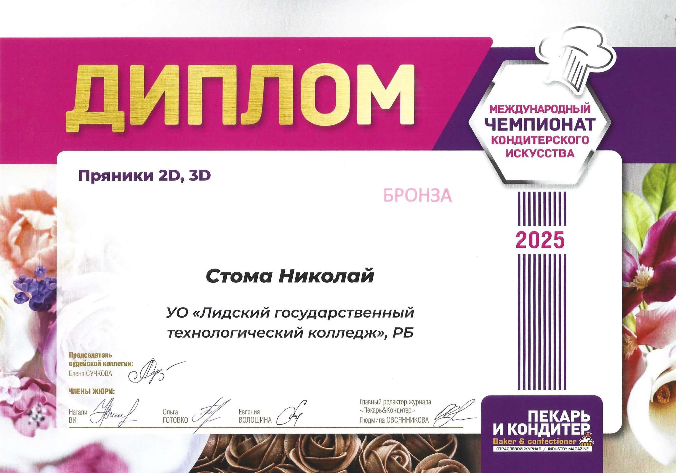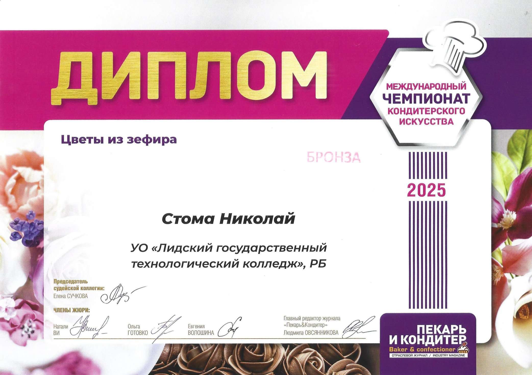 Две бронзовые медали на счету учащегося 3-го курса колледжа Николая Стомы. Николай представил работы из зефира "Глобус грёз" и композицию из пряников "Мы помним, мы гордимся" На конкурс его готовили Наталья Леонардовна Матылевич, Людмила Юзефовна Кондыбо, Ефремова Ольга Викторовна.