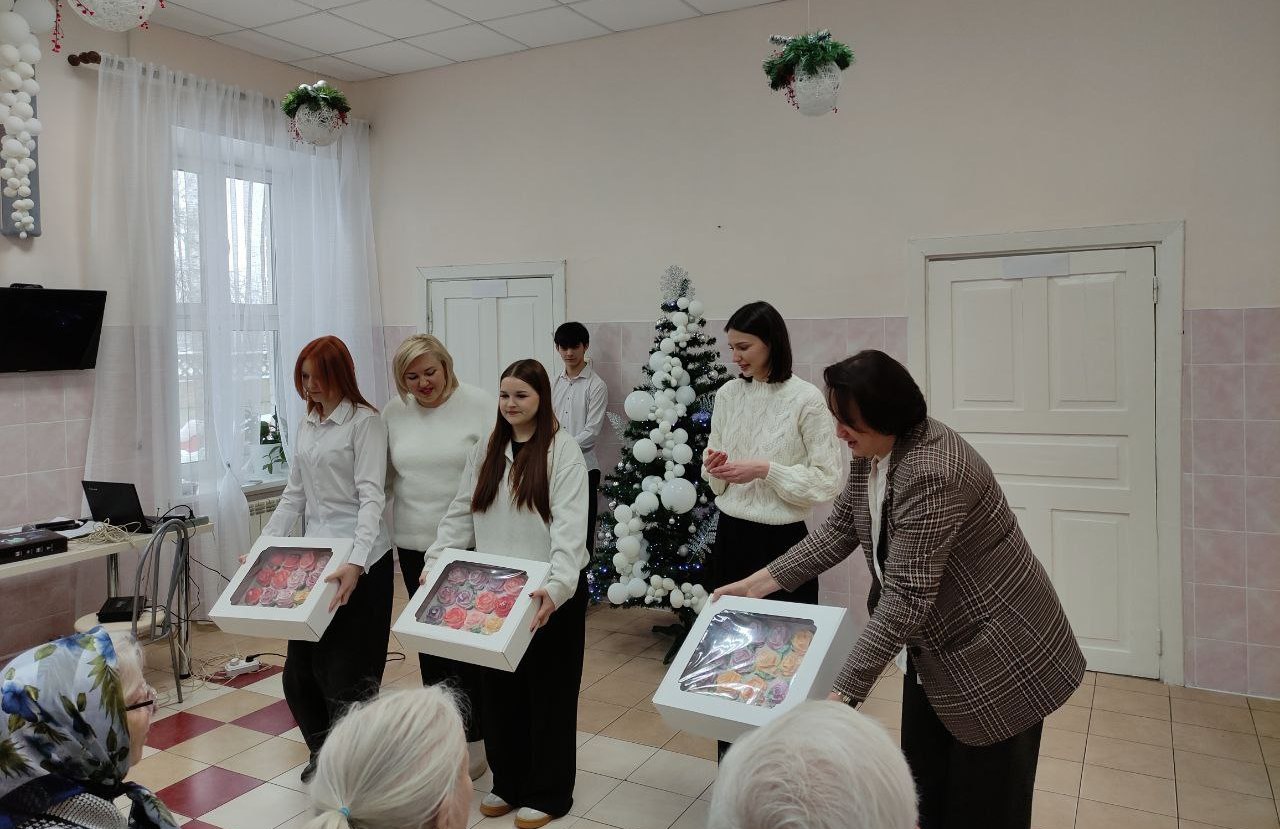 Волонтеры исполнили новогодние песни, озвучили новогодние пожелания и подарили бабушкам и дедушкам наборы зефира ручной работы.
