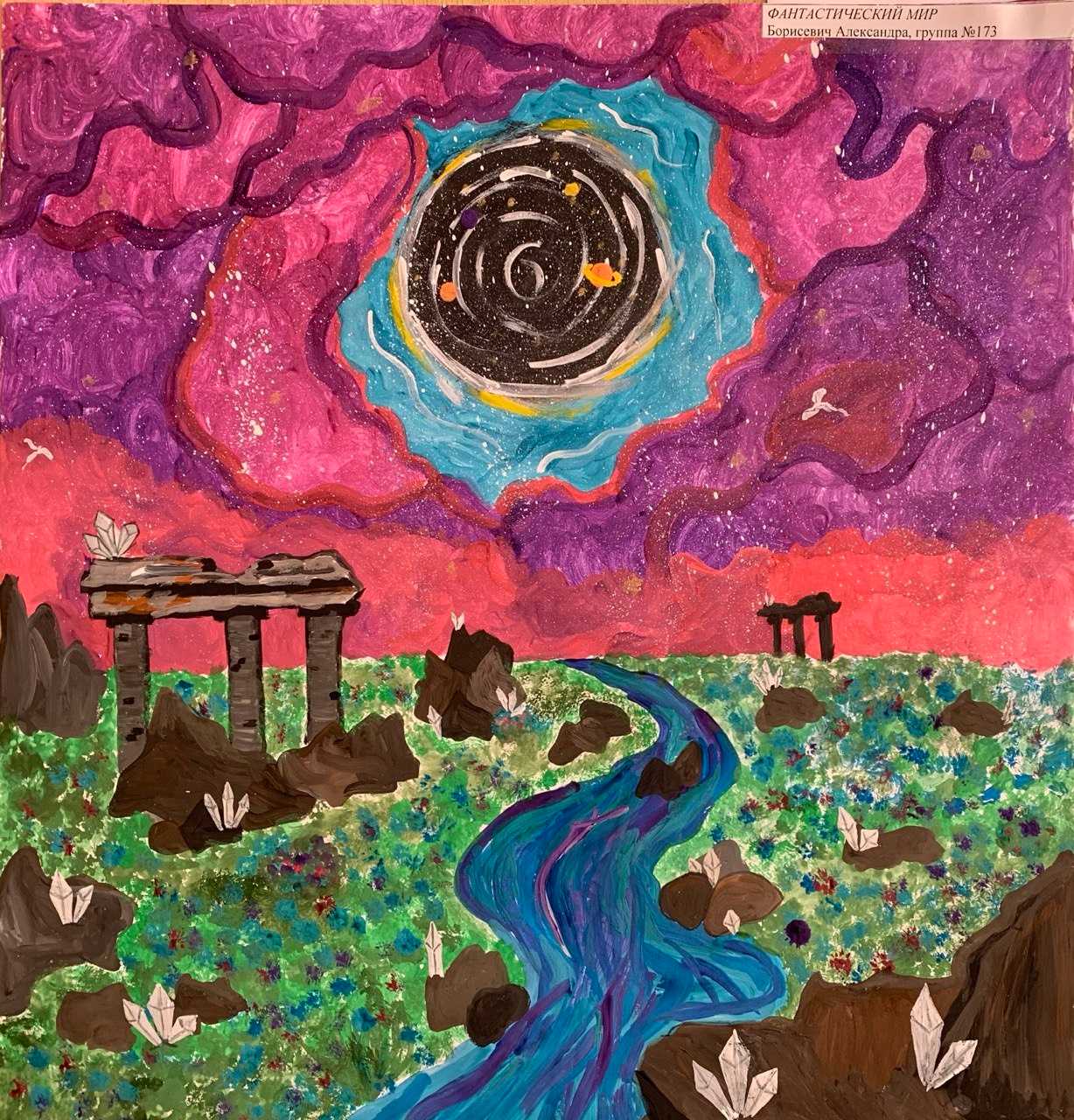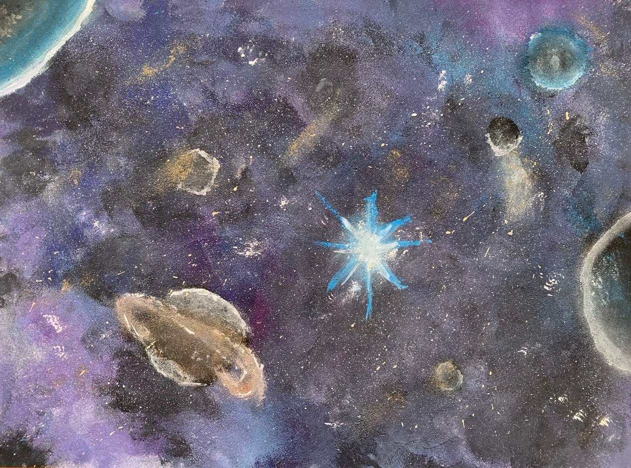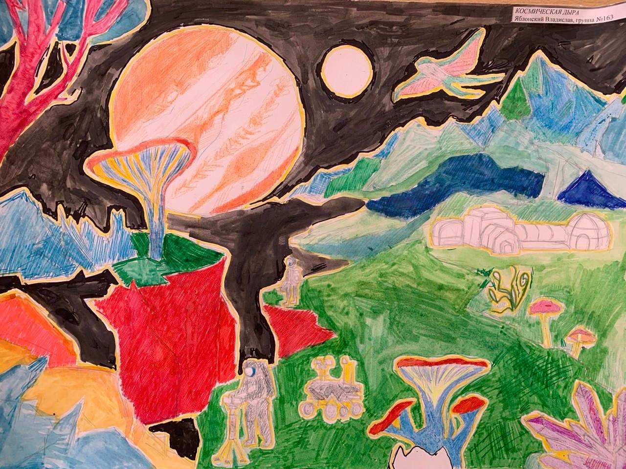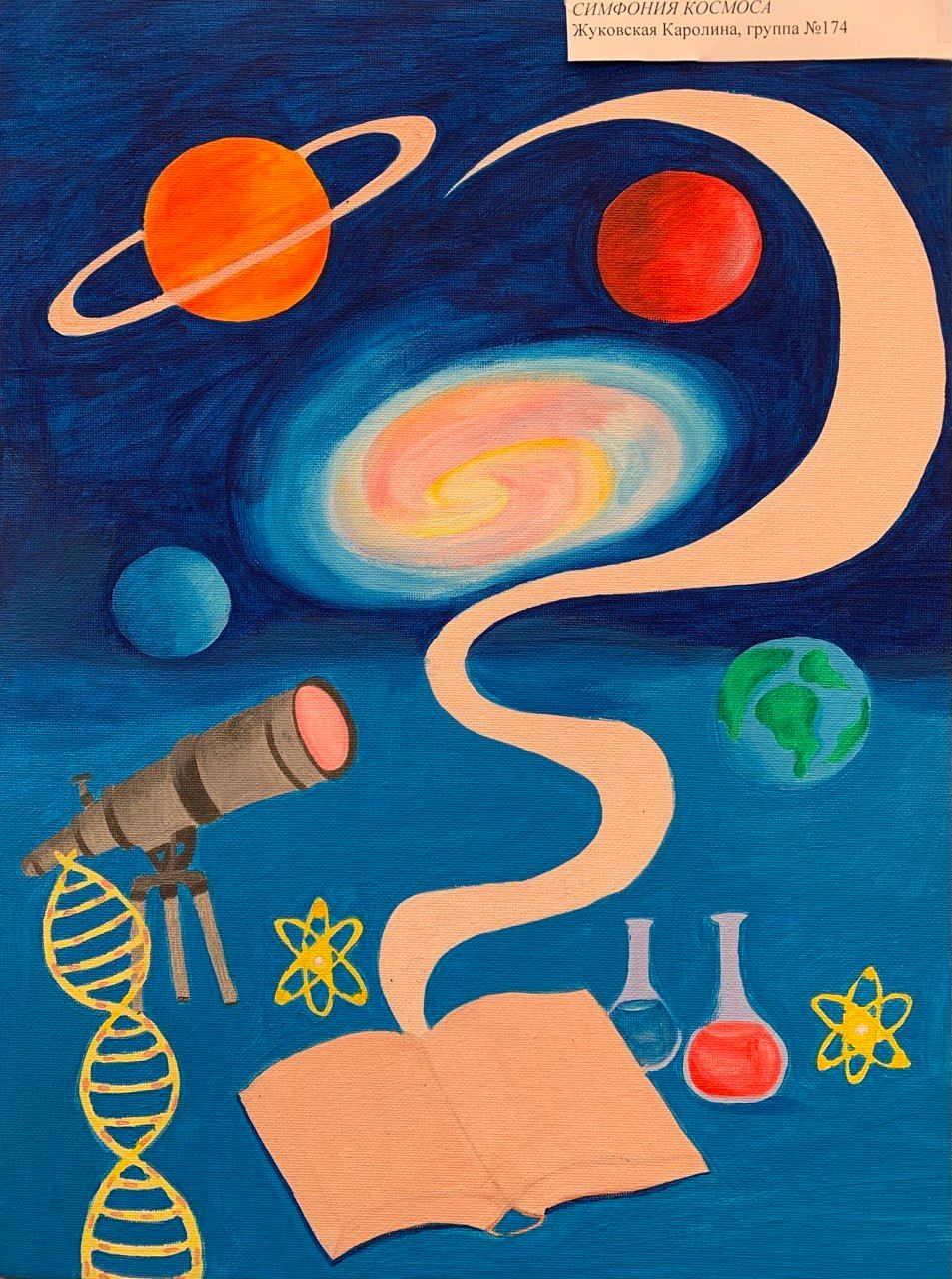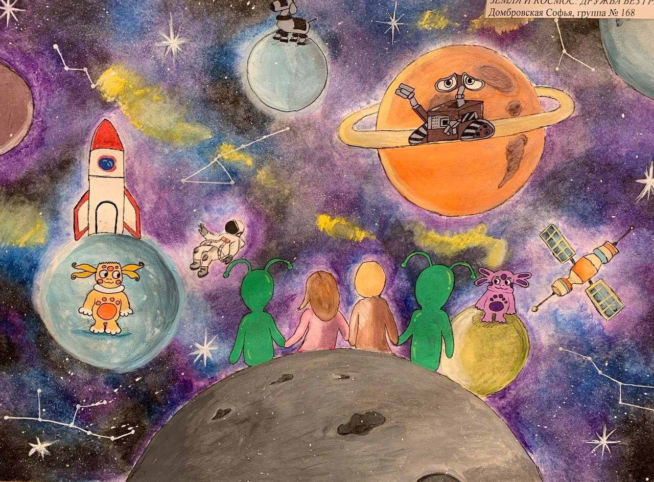 На выставке обучающиеся представили работы, отражающие фантастические сюжеты и достижения в освоении Вселенной, демонстрируя творческий подход к теме познания космоса.