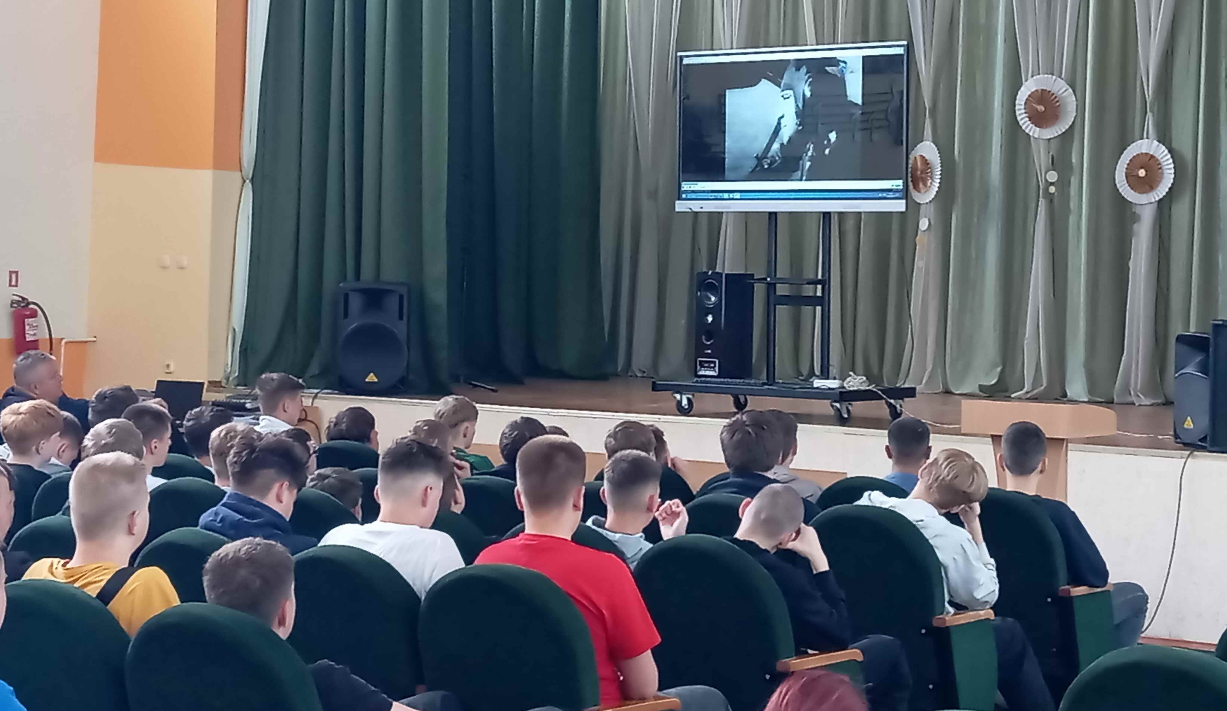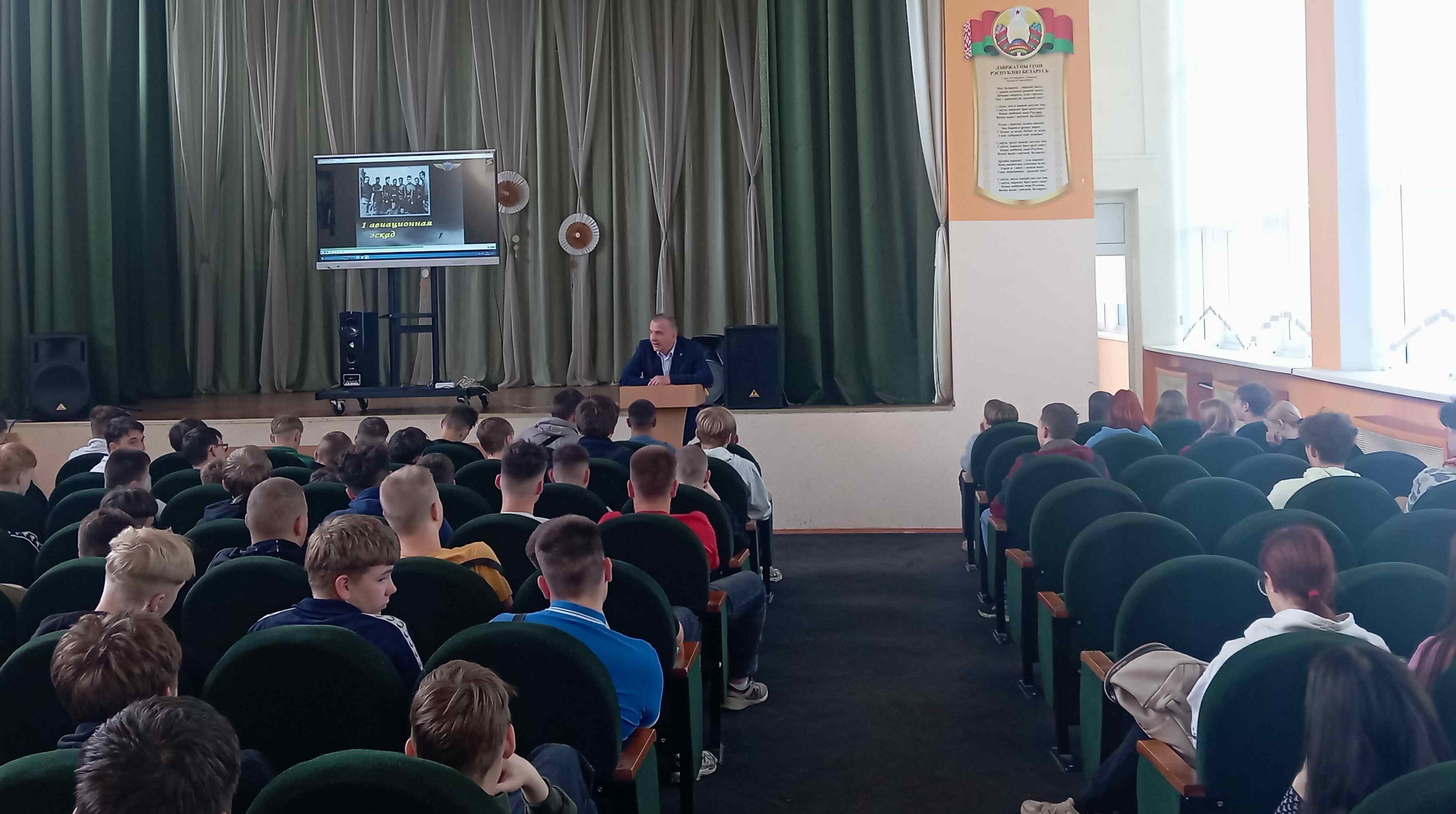 Перед ребятами выступил руководитель военно-патриотического воспитания колледжа Александр Николаевич Кузьмич. Он рассказал про славную героическую историю 116 гвардейской Краснознаменной Радомской штурмовой авиационной базы.